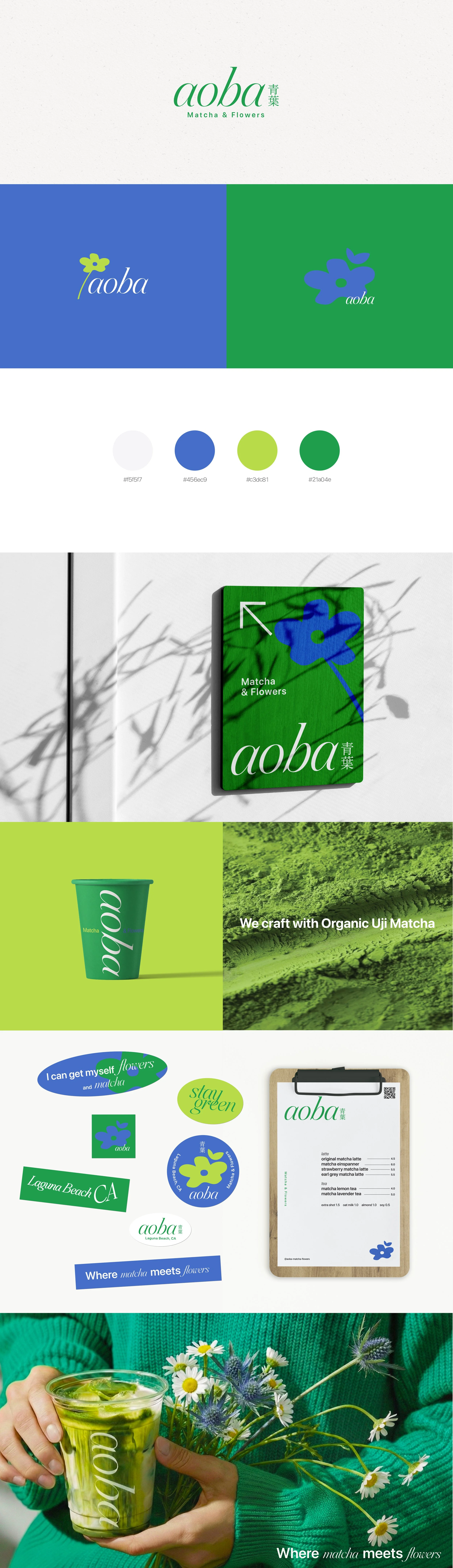Aoba is a contemporary brand concept offering organic matcha and fresh flowers. Its name, meaning fresh green leaves, is expressed through a minimal identity in green and blue that evokes clarity and vitality. Unified across logotype, packaging, and promotional visuals, AI-assisted image exploration supports the visual direction, resulting in a cohesive modern look.