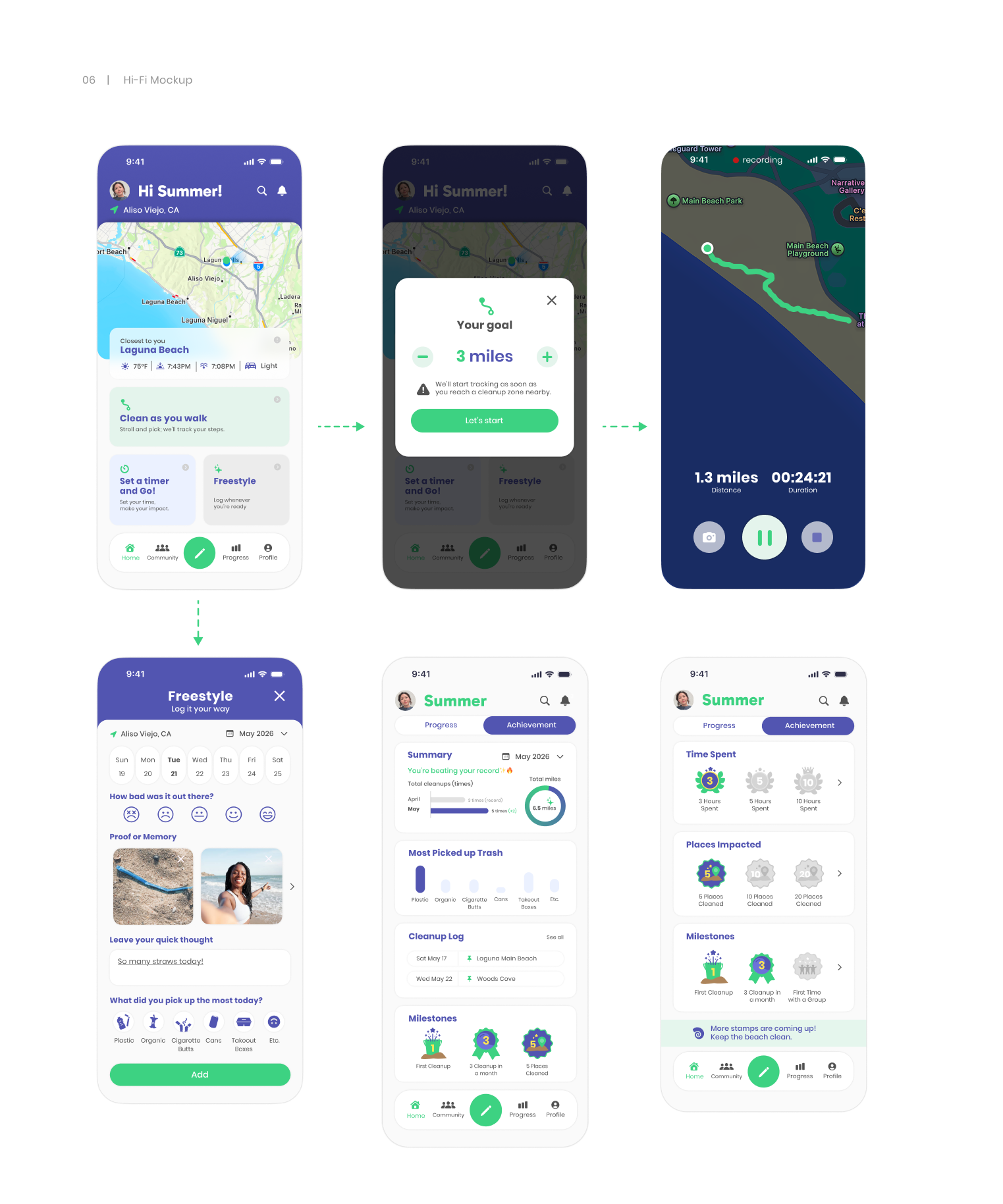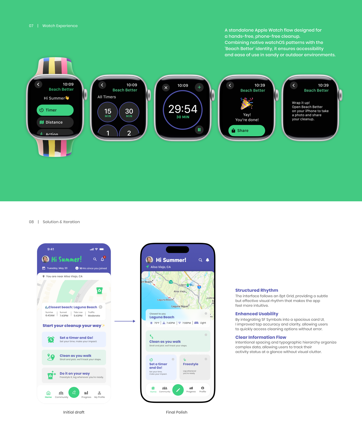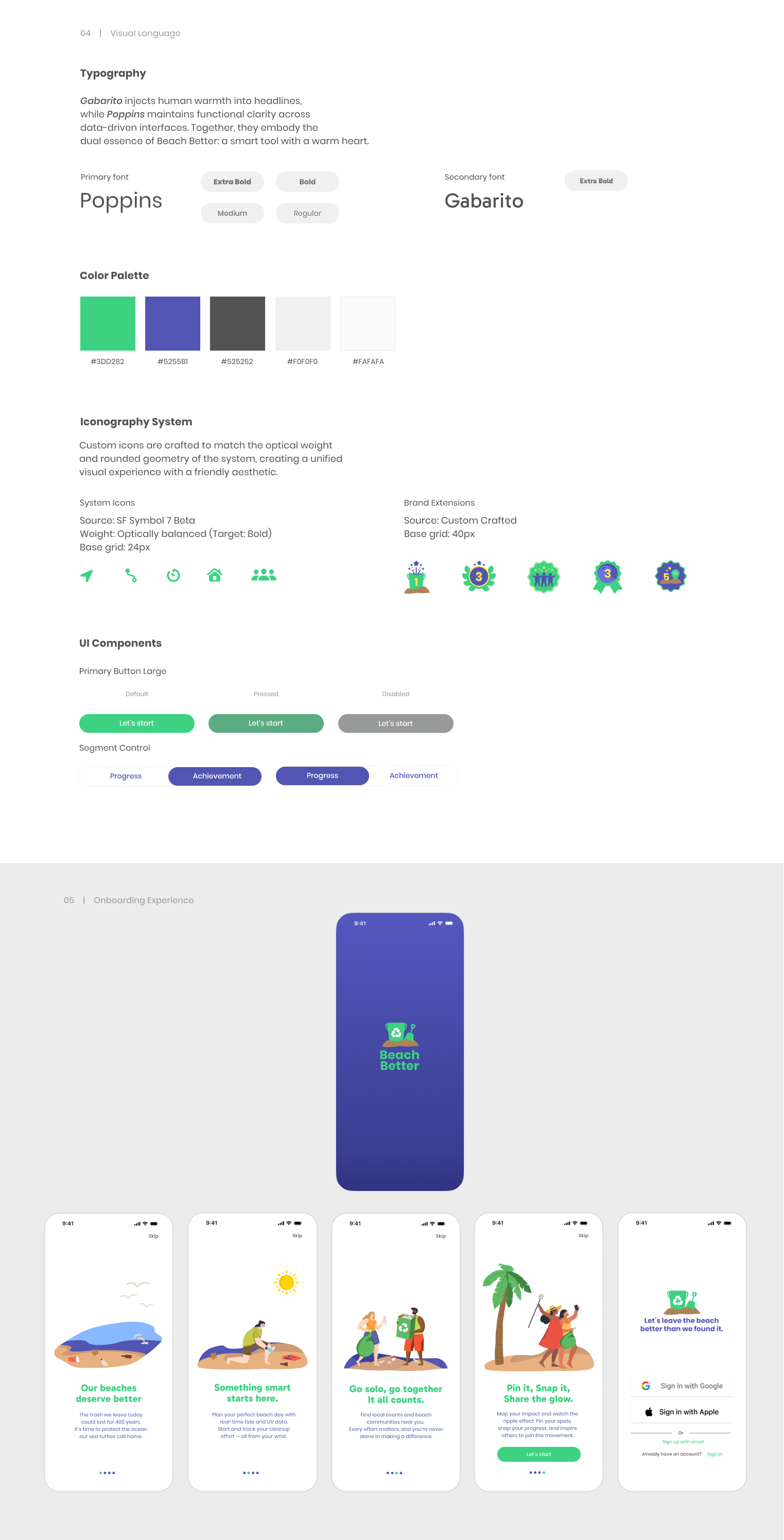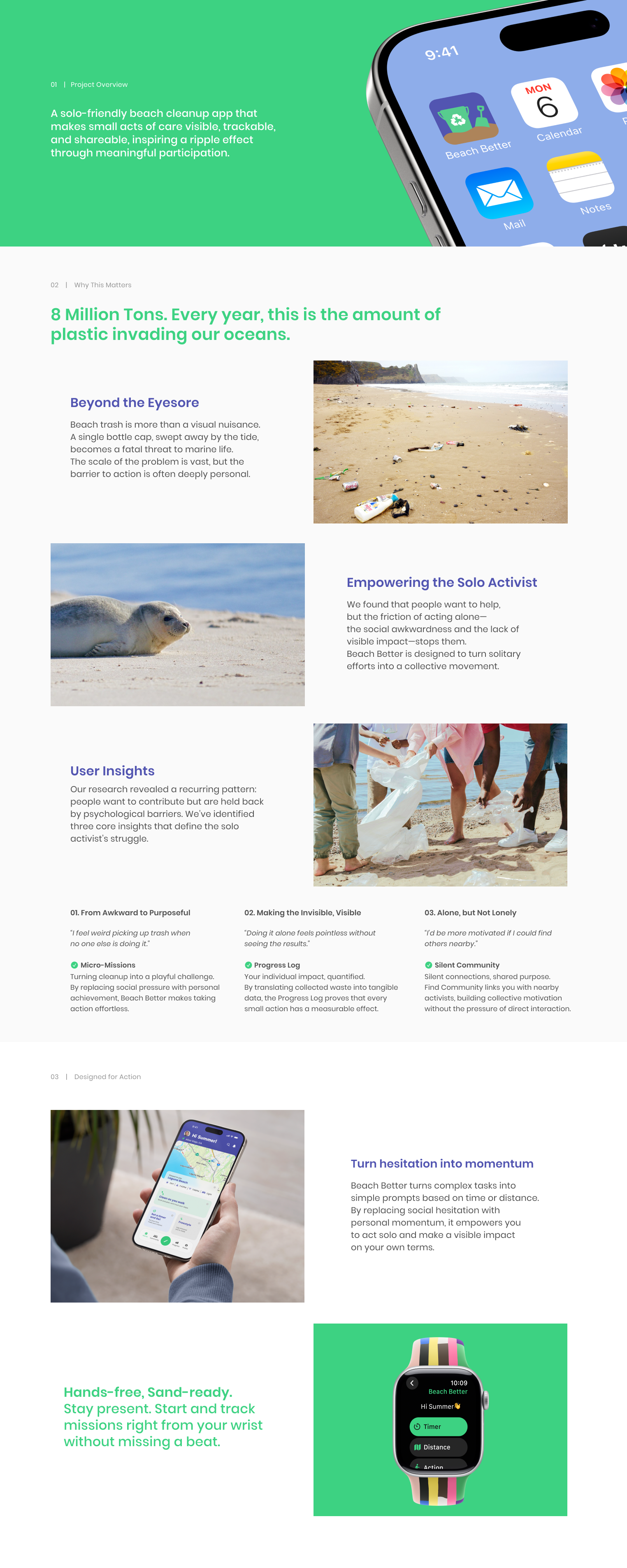 Beach Better is a solo-friendly beach cleanup app designed to make small efforts visible, trackable, and worth sharing. From onboarding to mission tracking and smartwatch integration, the app encourages action through simple UX and playful UI. It breaks large environmental problems into approachable moments—timed, distance-based, or freestyle—anywhere, anytime.